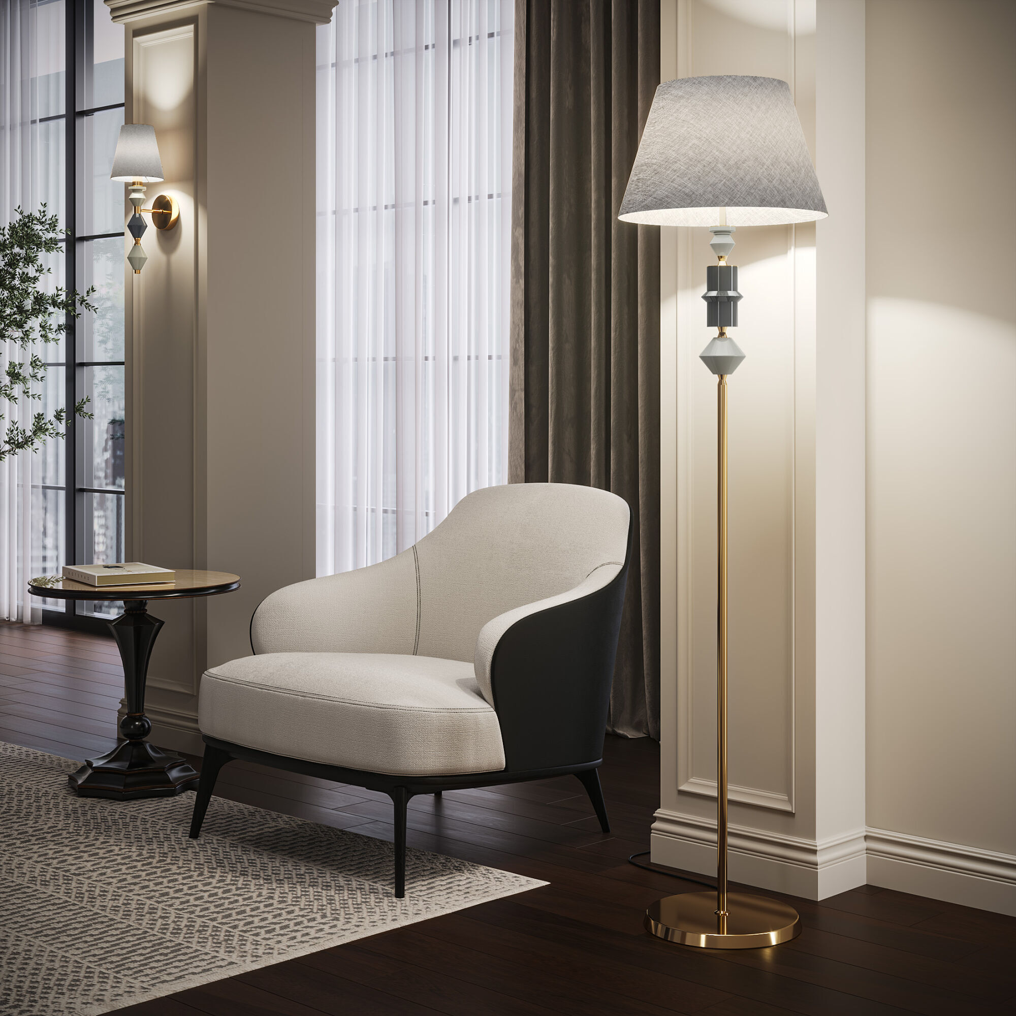 Адаптивность: Монохромное исполнение позволяет интегрировать торшер в любые цветовые палитры - от монохромного минимализма до сложных эклектичных пространств.