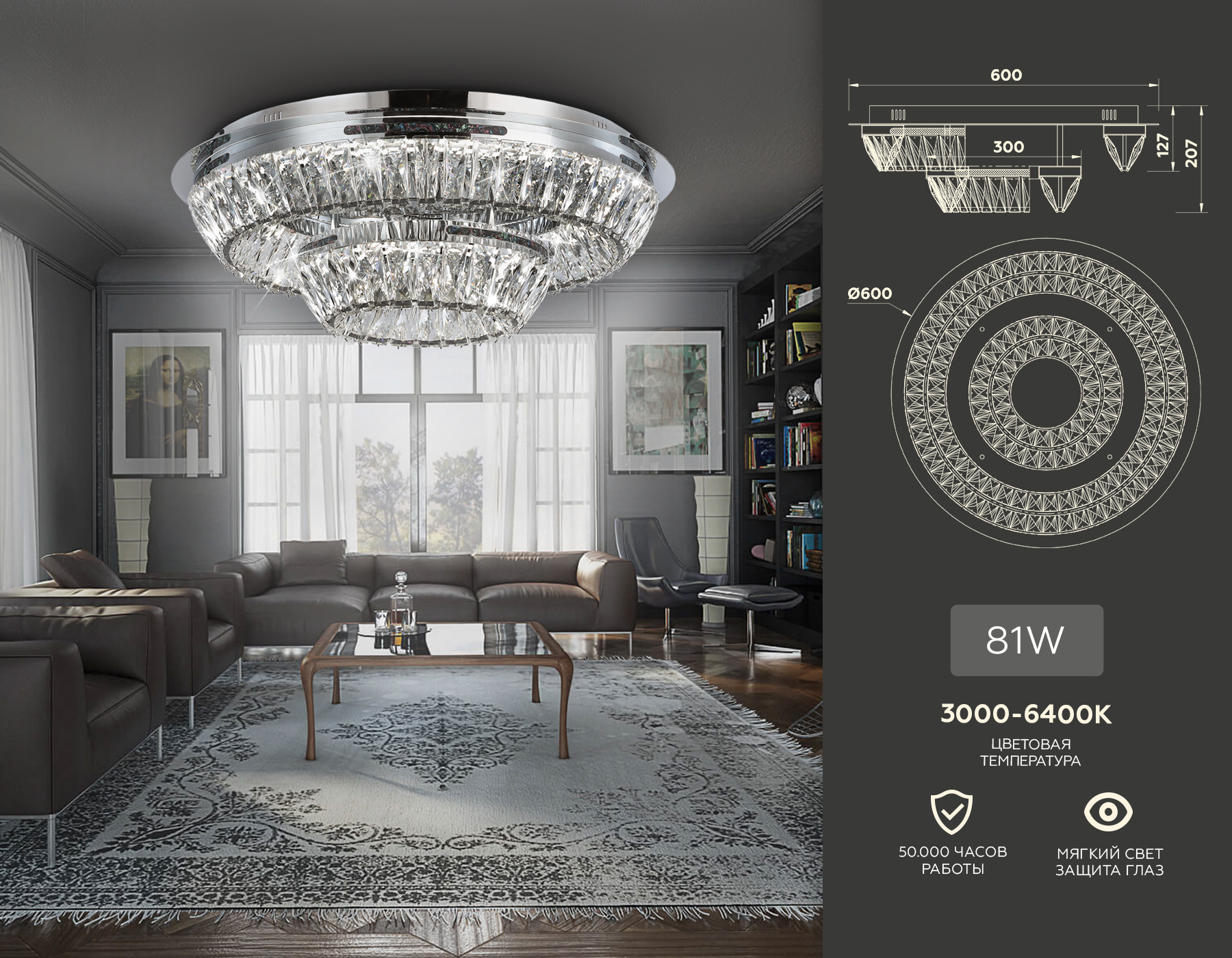 Потолочная светодиодная люстра с хрусталем TR5029 CH/CL хром/прозрачный 3000K/4200K/6400K 81W D600*207 (Без ПДУ)
