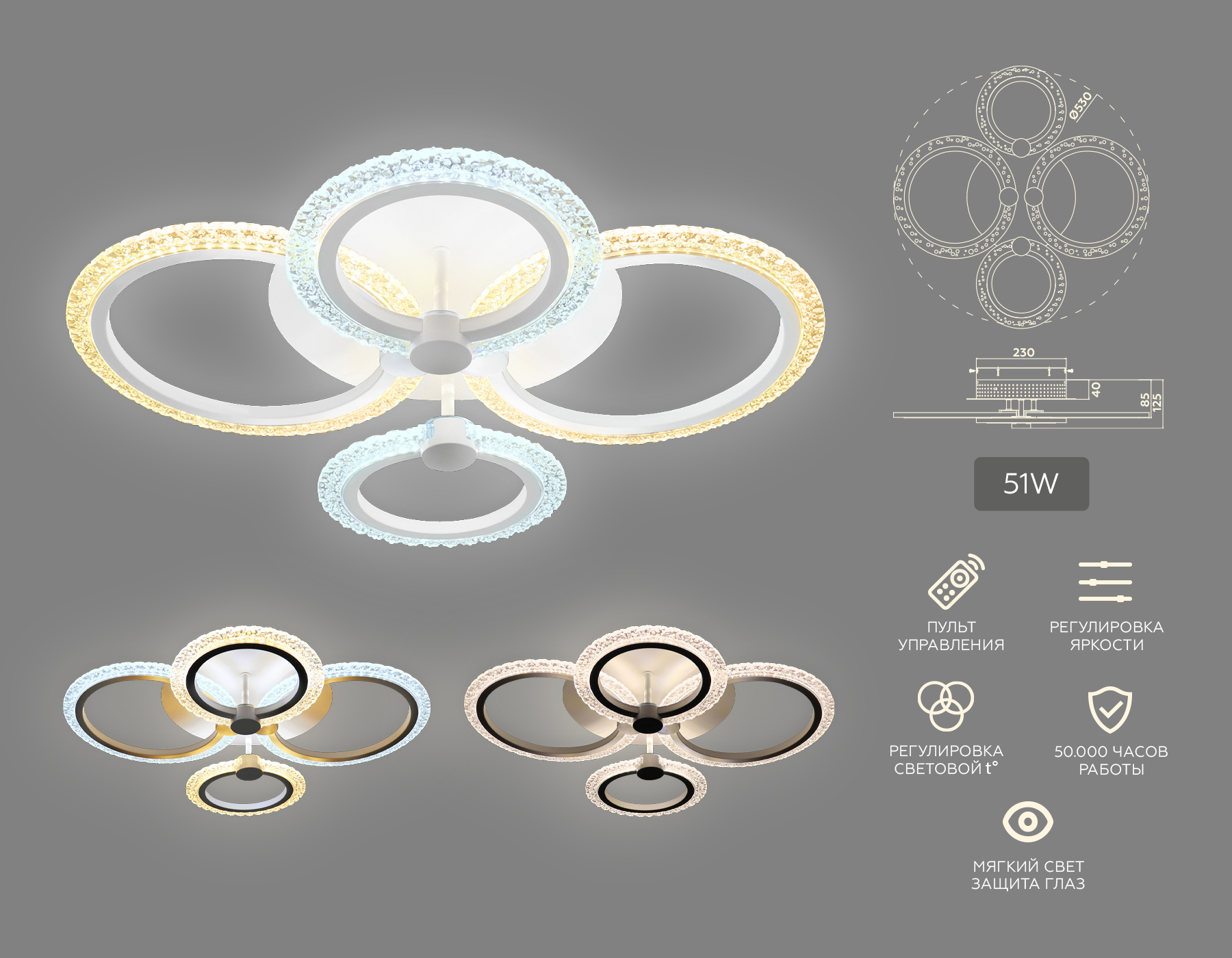 Потолочный светодиодный светильник с пультом FA4061/4 WH белый 4200K/3000+6400K/6400K+3000K 51W 530*480*125 (ПДУ ИК)