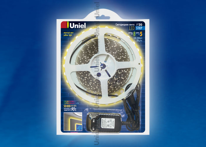 ULS-3528-60LED/m-8mm-IP20-DC12V-YELLOW Лента светодиодная UNIEL. Серия «Готовые решения» - катушка 5 м в блистере. В комплекте с адаптером. IP20. Желт